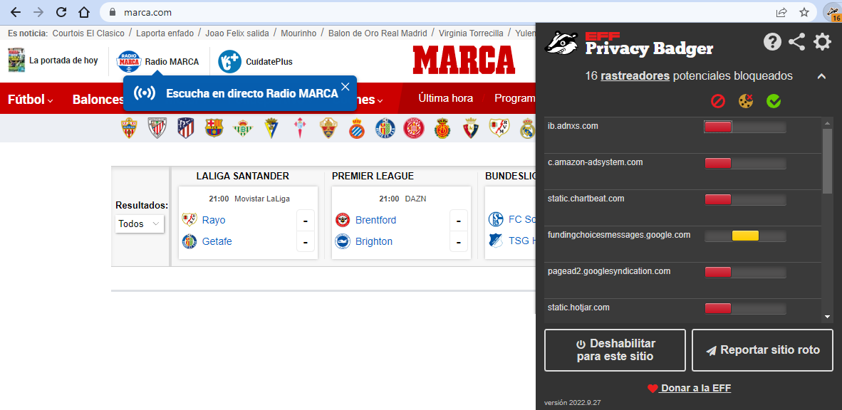 Por ejemplo, si entramos en la página web del Marca veremos todos los rastreadores que ha bloqueado.