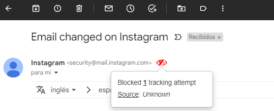 Si miramos en nuestro correo electrónico, comprobaremos que los correos de Instagram contienen un rastreador.