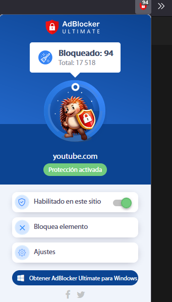 Si entramos en YouTube podemos ver que ha bloqueado 94 anuncios y en total ha bloqueado 17.518.