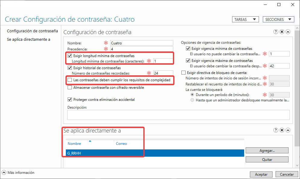 Exigiremos una longitud mínima de 1 carácter y desmarcaremos la opción Las contraseñas deben cumplir los requisitos de complejidad. Asignaremos esta configuración directamente al grupo de Recursos Humanos.