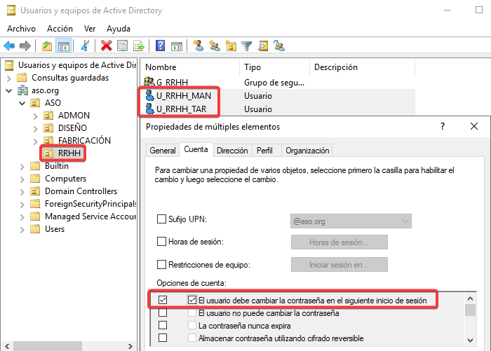 Luego, seleccionaremos los dos usuarios de Recursos Humanos y configuraremos que tengan que cambiar la contraseña en el siguiente inicio de sesión.