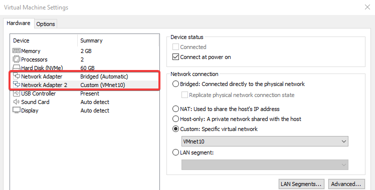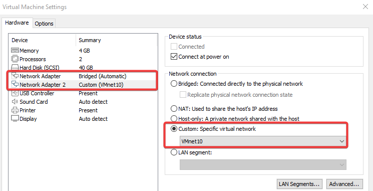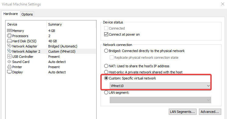 Crearemos una nueva máquina virtual Windows 10 y le añadiremos un adaptador Custom para que se pueda conectar con el servidor.
