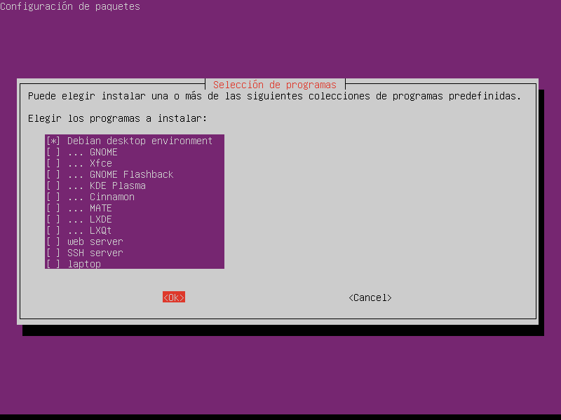 Seleccionamos el entorno de escritorio de Debian.