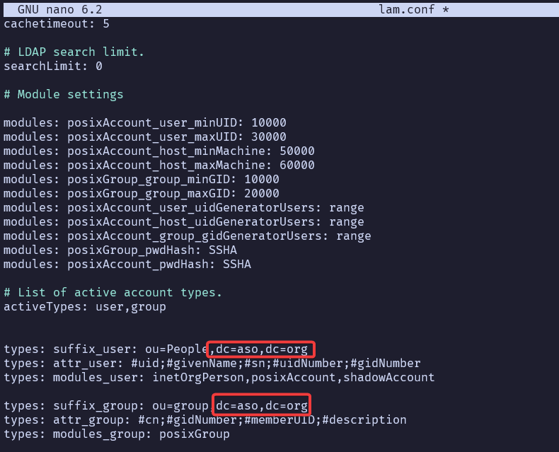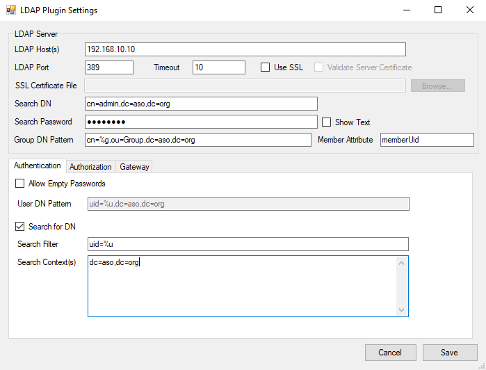 Indicamos los parámetros para la configuración con el servidor LDAP.