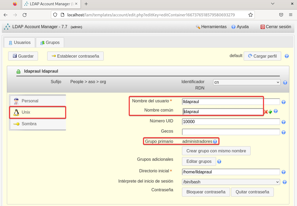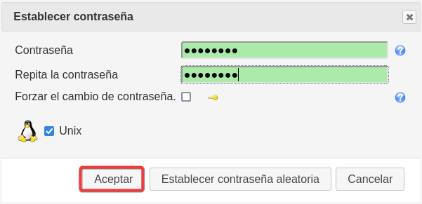 Creamos este usuario para Unix también, y le establecemos una contraseña otra vez.