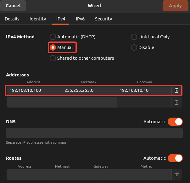 Estableceremos una configuración IP manual.