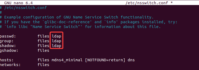 Luego, editamos el archivo /etc/nssswitch.conf