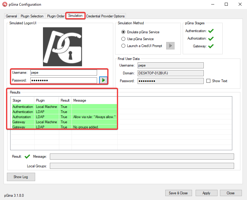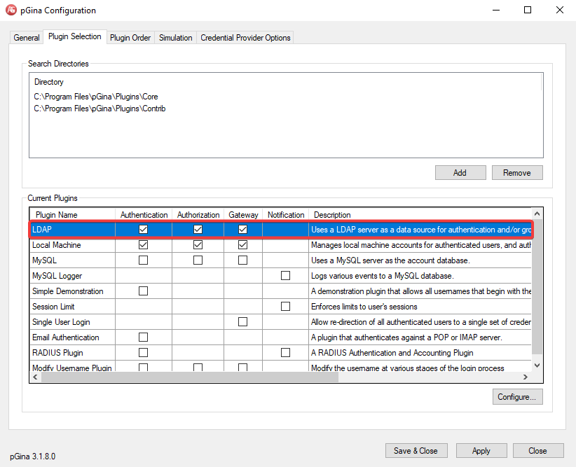 En pGina, habilitamos los plugins de LDAP y aplicamos los cambios. Luego, pulsamos en el botón Configure