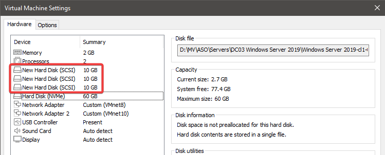 Primero, añadiremos 3 nuevos discos duros con 10 GB de capacidad cada uno, en el servidor DC03.