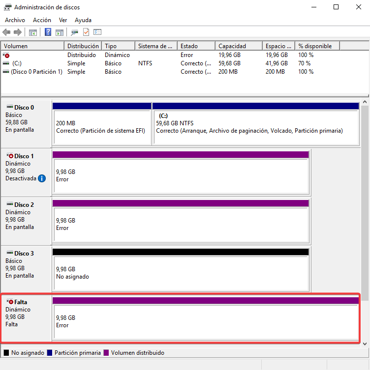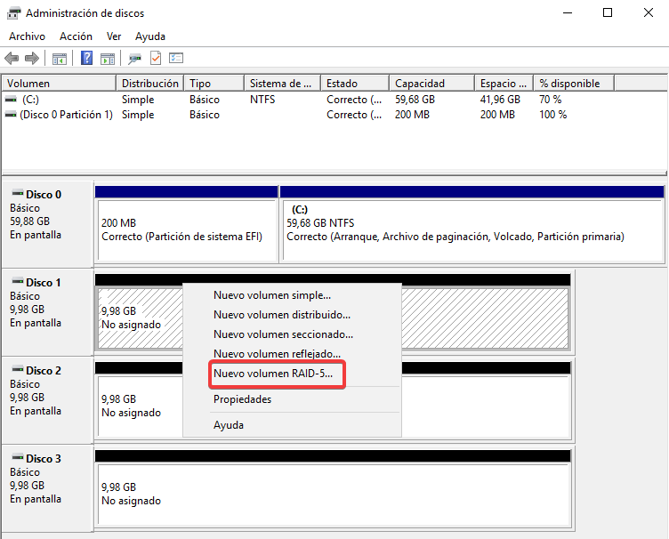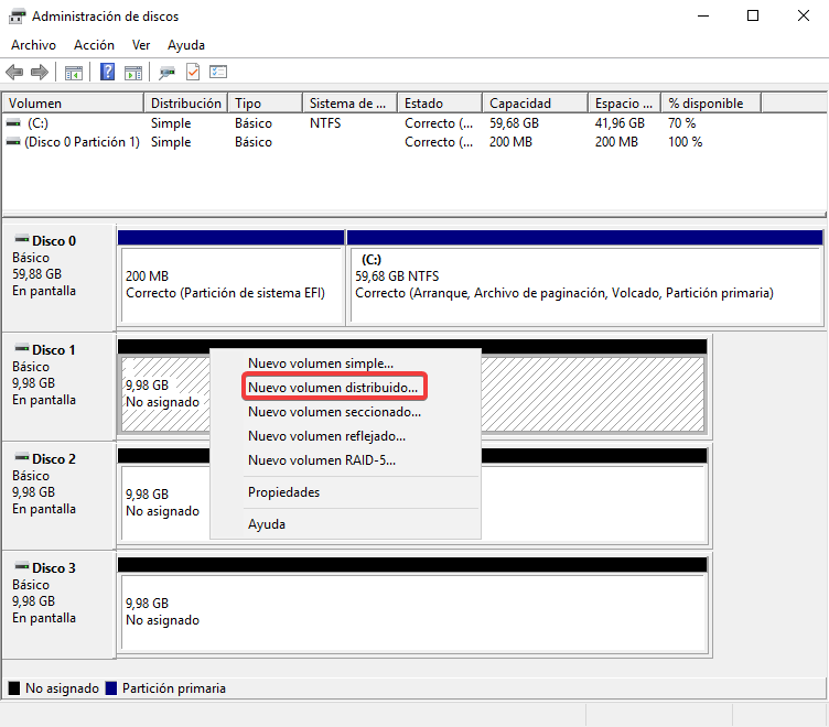 Ahora, iniciaremos los discos y crearemos un nuevo volumen distribuido.