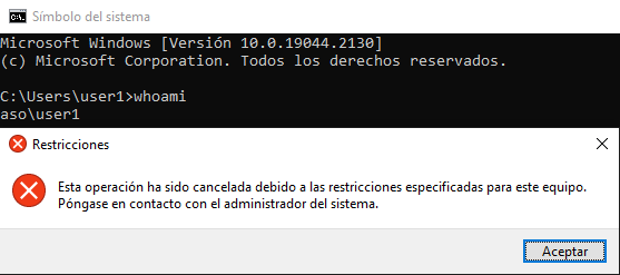 Forzaremos la actualización de las directivas y veremos que no podemos apagar ni reiniciar el equipo mediante el user1.