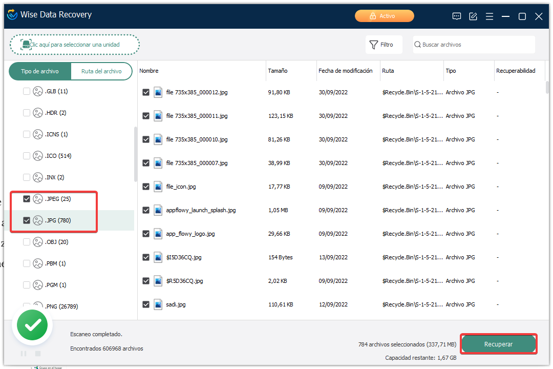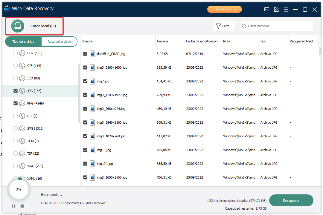 Wise Data Recovery es una alternativa perfecta a otros programas de recuperación de archivos. Es muy práctica ya que puedes filtrar por extensión de archivos o por la ruta.