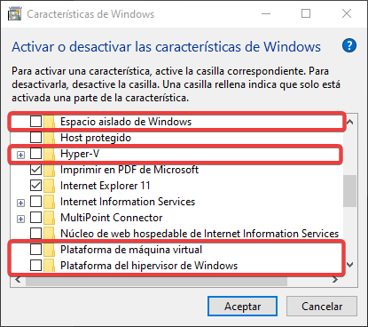 Primero, nos aseguraremos que tenemos estas características desactivadas en nuestro equipo Windows 10 local para evitar problemas con la virtualización después.