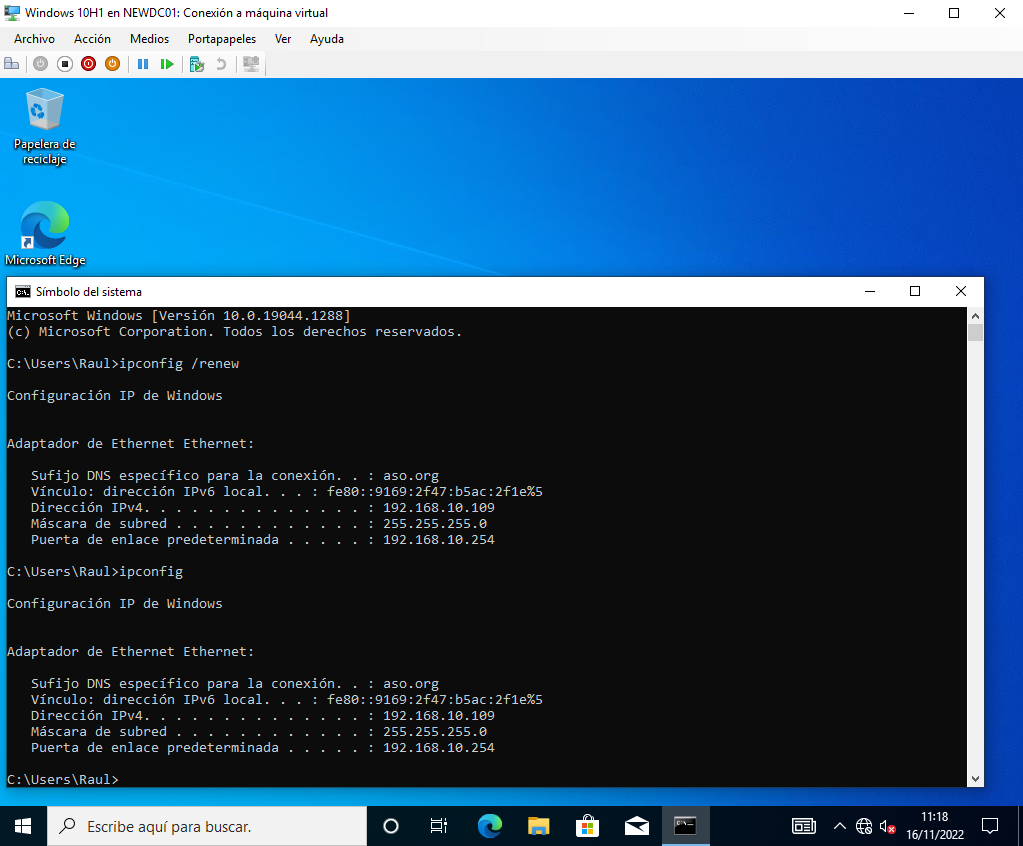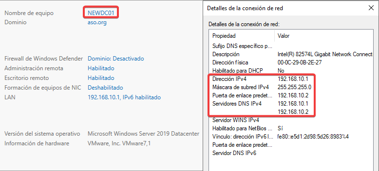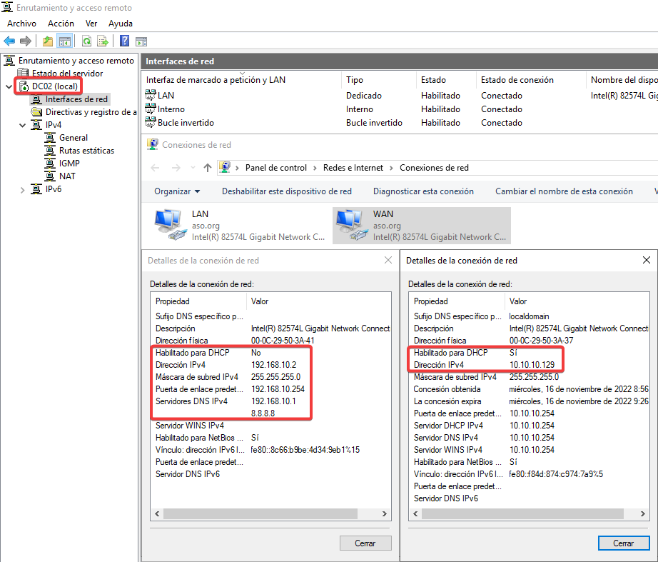 Nos aseguramos que el servidor DC02 tiene las 2 interfaces de red configuradas para enrutar paquetes como hicimos en esta práctica.