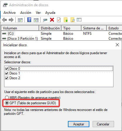 Ahora, entraremos en el Administrador de Discos de NEWDC01 e inicializamos los discos con GPT.