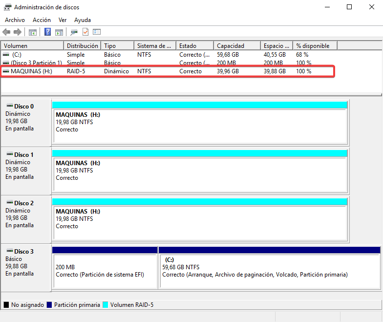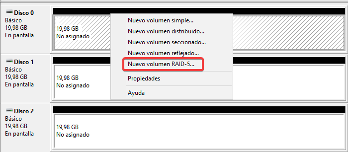 Haciendo clic derecho sobre un disco, crearemos un nuevo volumen RAID-5.