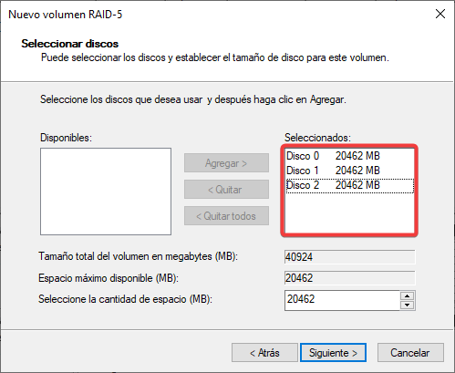 Seleccionamos los 3 discos que van a formar parte del RAID.