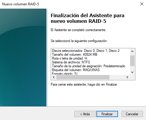 Primero especificamos un nombre y la ubicación la unidad RAID que hemos creado antes.