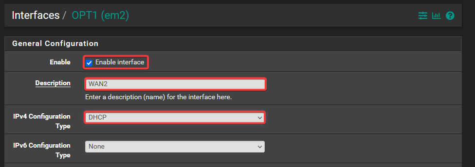 Habilitamos esta interfaz, le daremos el nombre WAN2