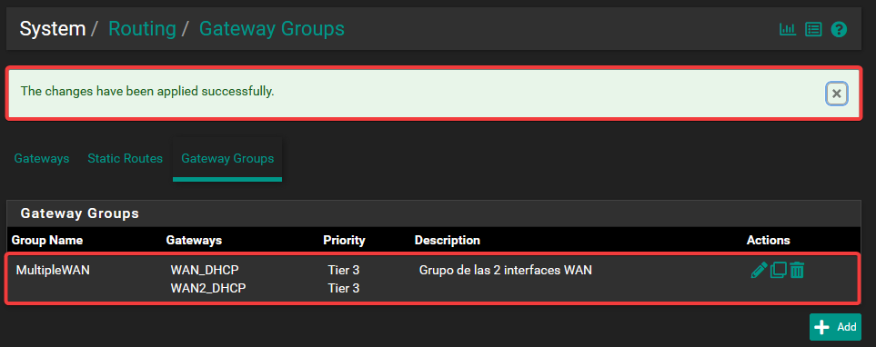 Ahora, seleccionaremos el nuevo grupo de puerta de enlace como predeterminada.