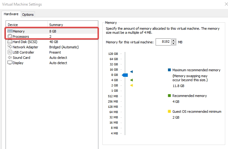Primero, crearemos una nueva máquina virtual Ubuntu Server con 8GB de RAM y 2 procesadores.