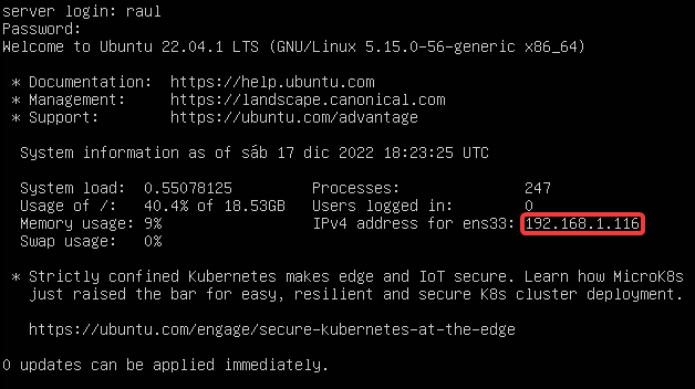 Iniciaremos sesión y observaremos la dirección IP para conectarnos mediante SSH.