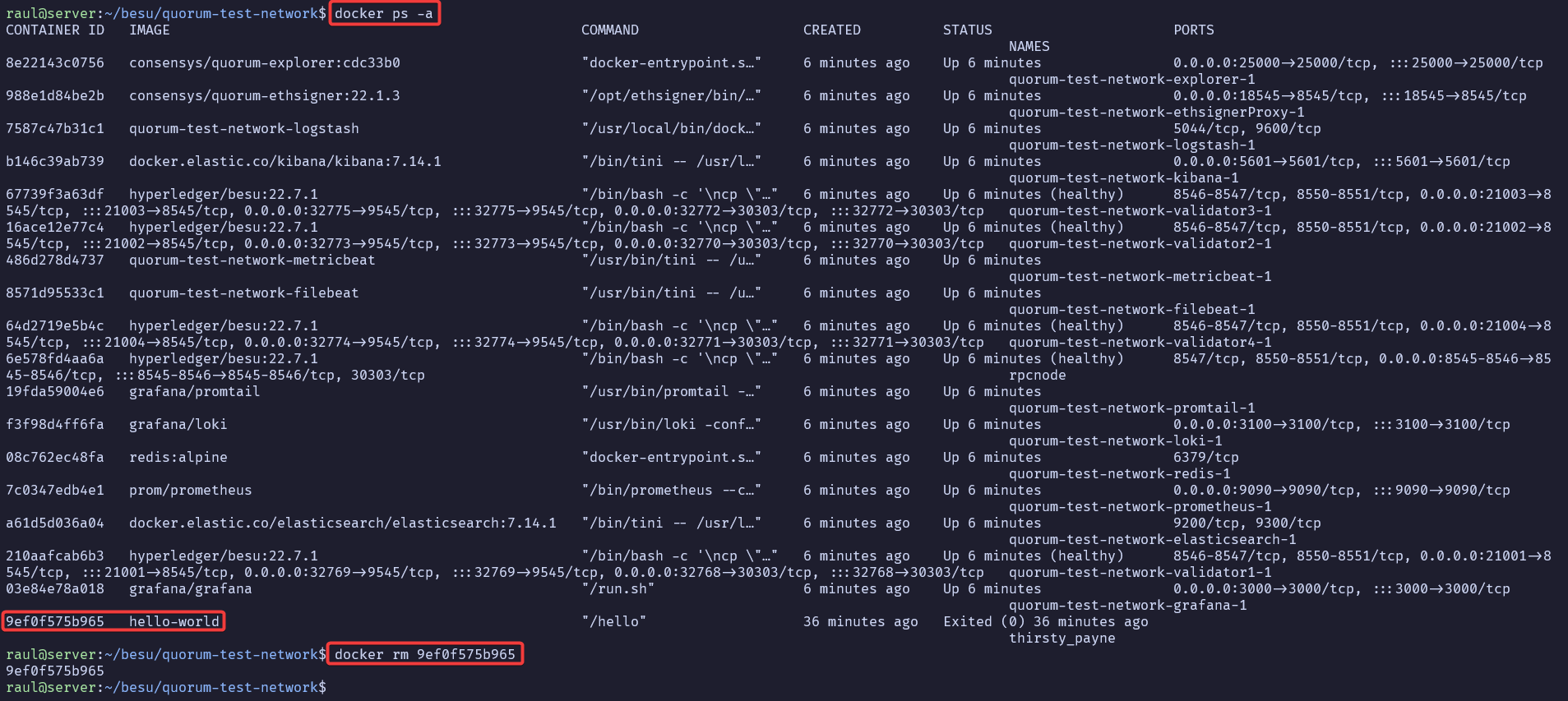Usando el comando docker ps -a, veremos todos los contenedores, y borraremos el hello-world.