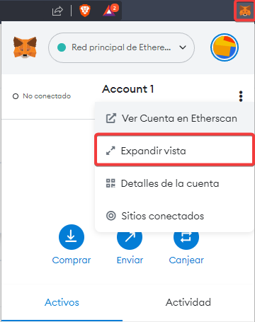 Utilizaremos la extensión Metamask como wallet para nuestra red. Una vez hayamos terminado la configuración inicial, expandiremos la vista para las configuraciones.