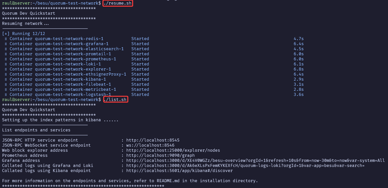 En el caso de que hayamos apagado la máquina, podemos volver a iniciarla usando el script resume.sh y volver a consultar todos los endpoints list.sh.