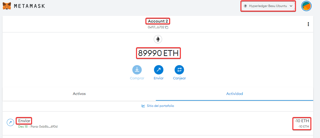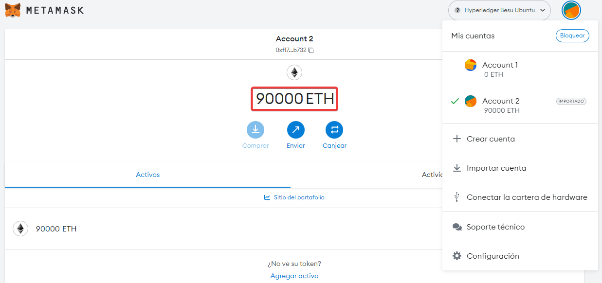 En esta wallet tendremos 90.000 Ethers, no son los reales (los de la mainnet). Solo son válidos en nuestra red.