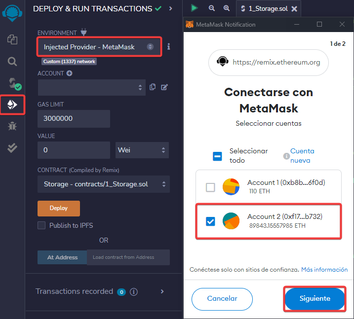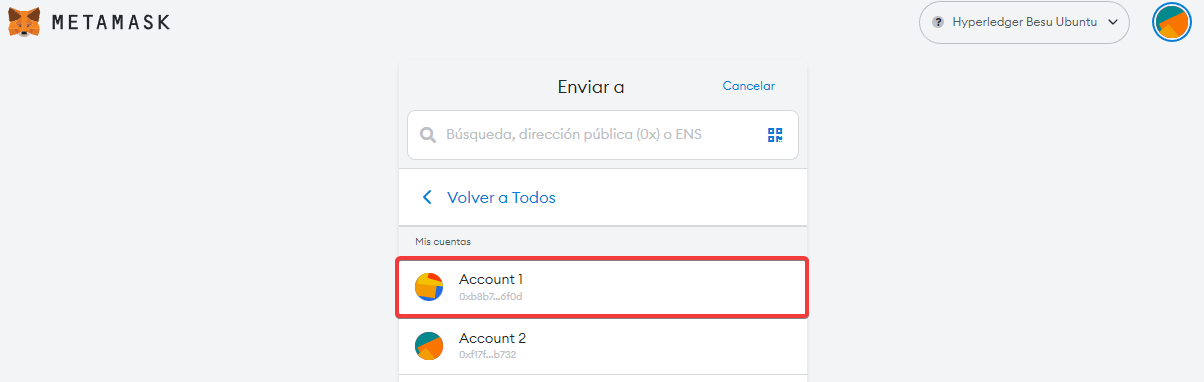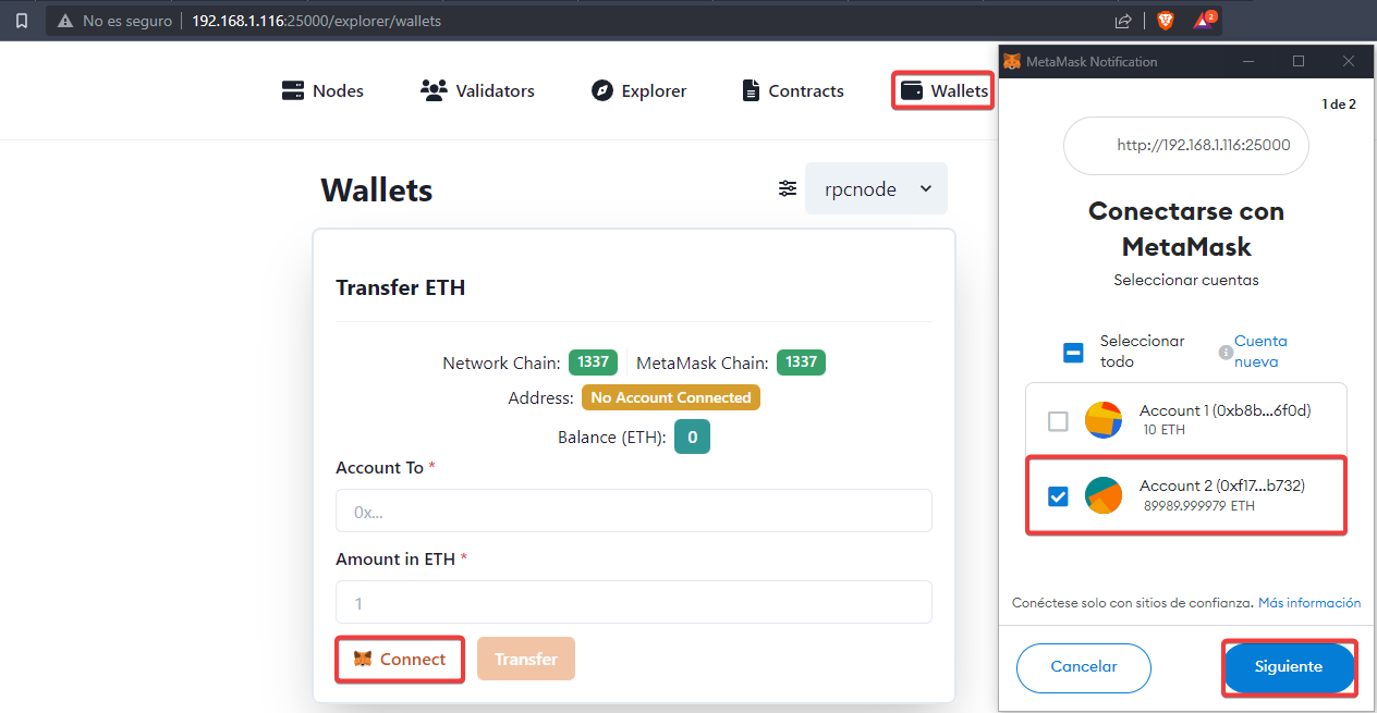 Otra manera de transferir tokens sería conectándonos al explorador con Metamask. Seleccionaremos la cuenta 2 y continuaremos.