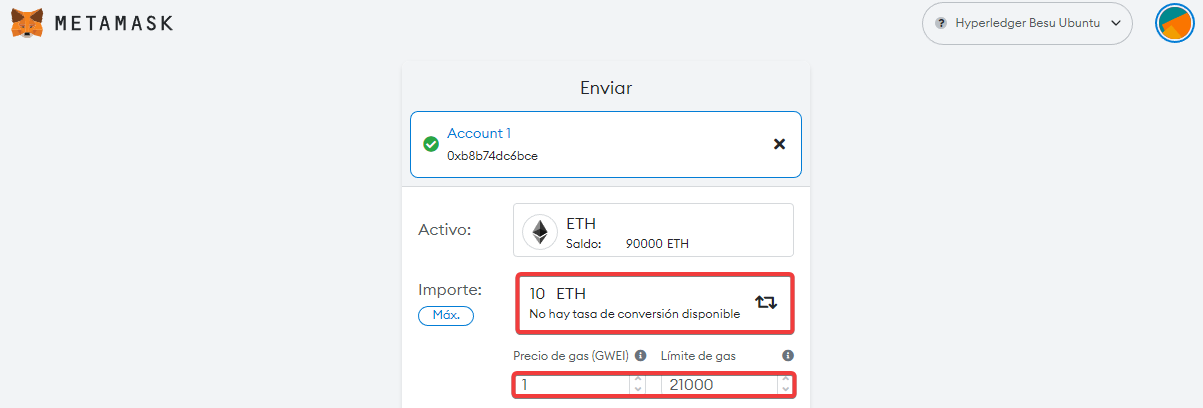 Le vamos a enviar 10 Ethers. También tendremos que darle gas para que se ejecute la transacción.