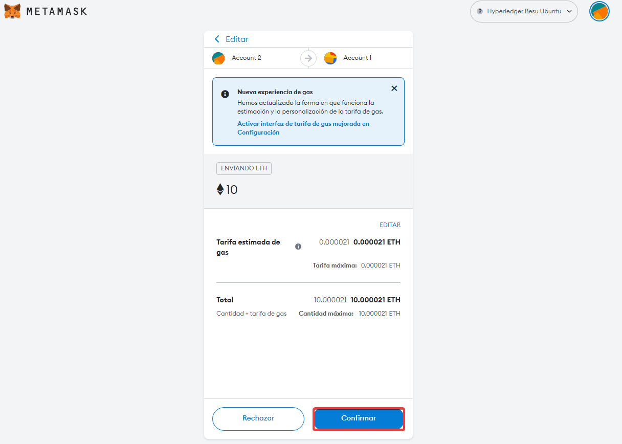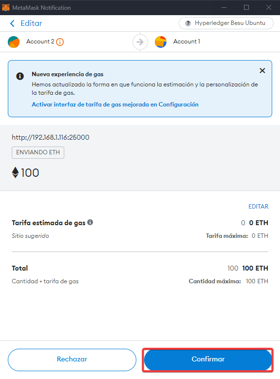 Confirmaremos la transacción desde la extensión.