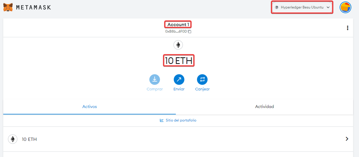 En la cuenta 1, ahora tendremos 10 Ethers (en nuestra red privada).