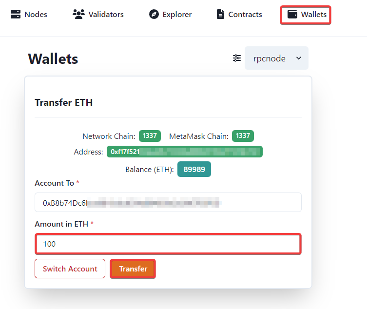 Una vez hayamos conectado la cuenta 2, pegaremos la dirección de la cuenta 1 para enviarle 100 Ethers.