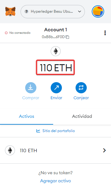 Consultaremos de nuevo la cuenta 1, y veremos que ahora tiene 110 Ethers.