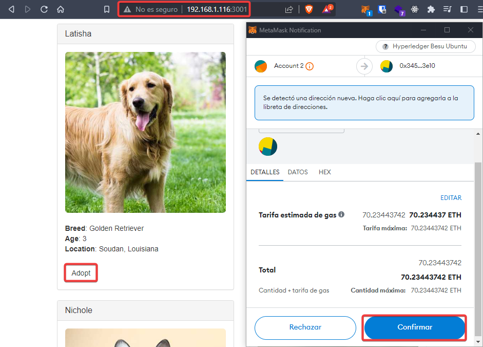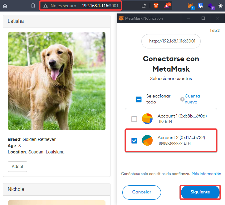 Cuando termine, podremos acceder a la aplicación a través del puerto 3001 y si pulsamos en adoptar, nos aparecerá Metamask y seleccionaremos la cuenta 2.