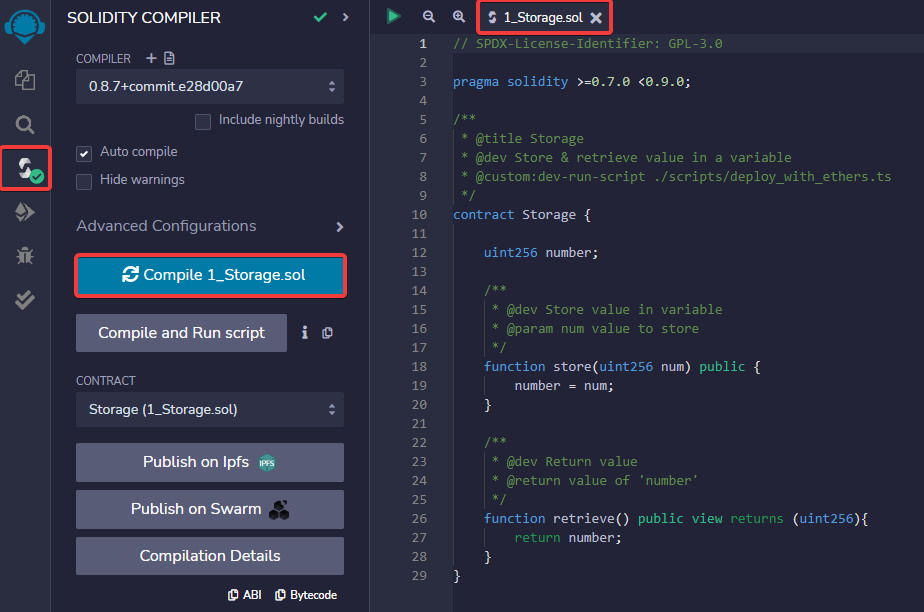 Después, usaremos Remix IDE para desplegar un contrato inteligente que almacenará un número en la blockchain y luego lo podremos consultar. Así que lo primero será compilarlo.
