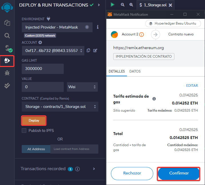 Confirmaremos la transacción para implementar el contrato.