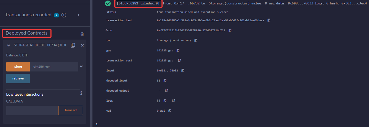 Una vez lo hayamos desplegado, podremos usarlo. En la ventana de la izquierda veremos un registro con la transacción de la implementación verificada.