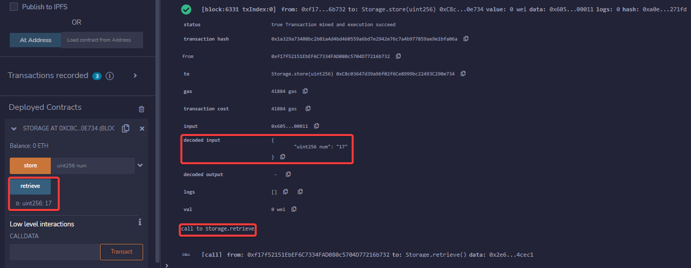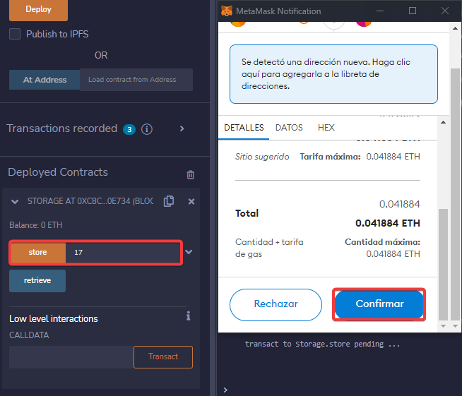 Para poder almacenar un número, llamaremos a la función del contrato con el número 17. Confirmaremos la transacción (el coste de procesamiento).