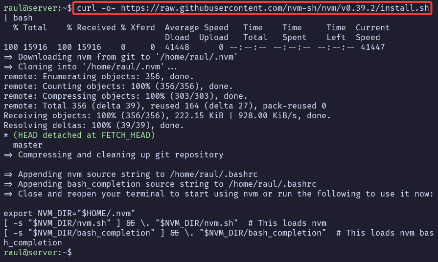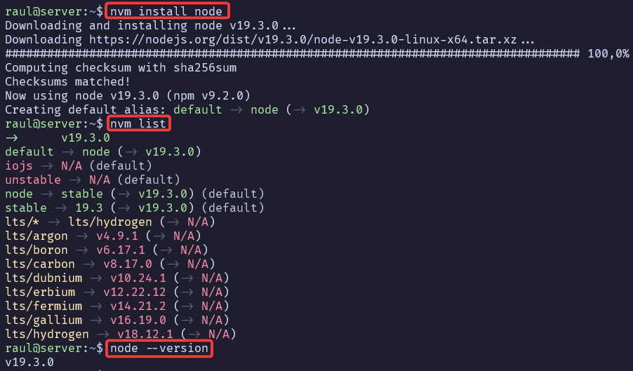 Reiniciaremos de nuevo el servidor, y ahora tendremos disponible el comando nvm para instalar, listar y utilizar diferentes versiones.