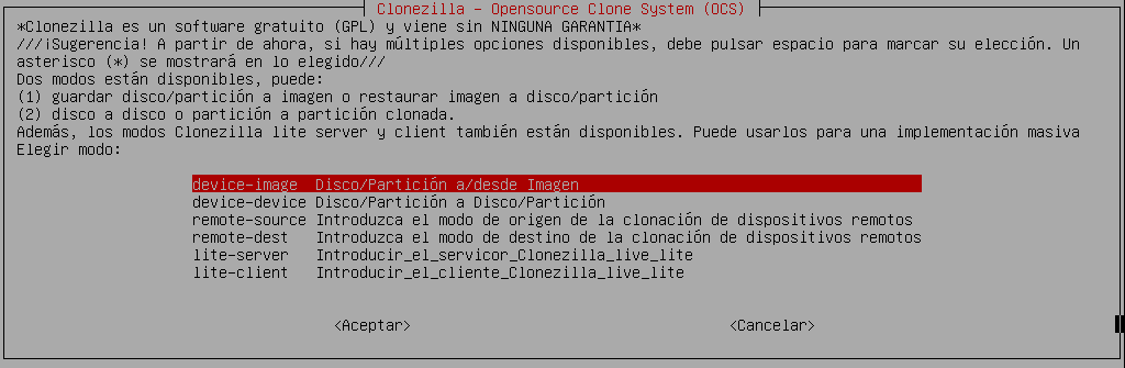 En el mismo equipo que hemos creado la imagen, iniciaremos un servidor Clonezilla.