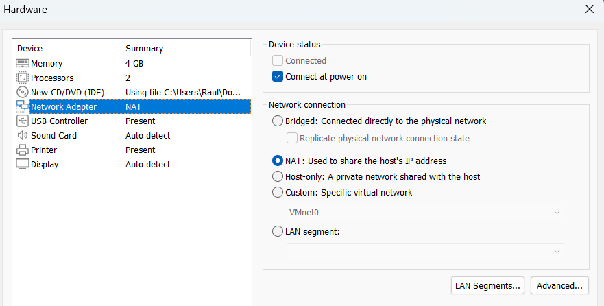 Configuraremos el hardware de la máquina virtual de esta manera.