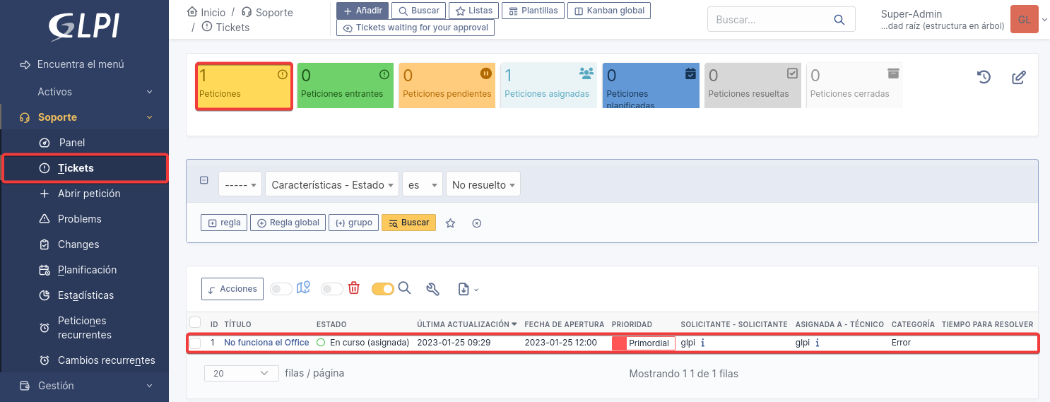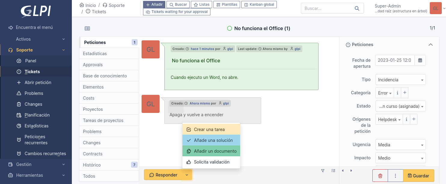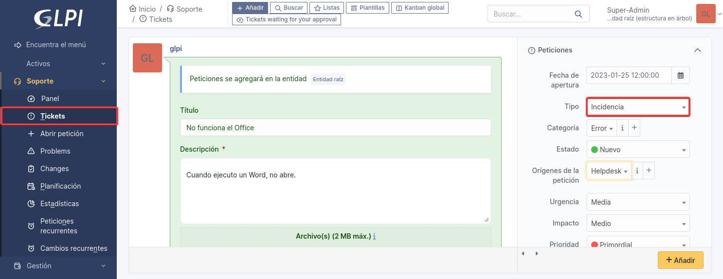Por último, vamos a crear un Ticket, por un error usando Office.