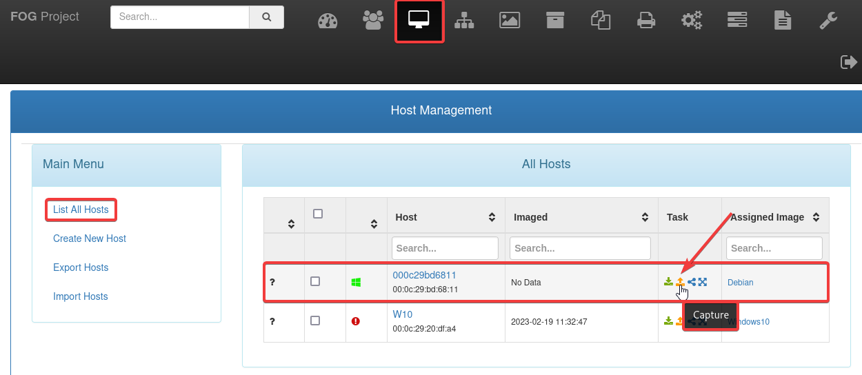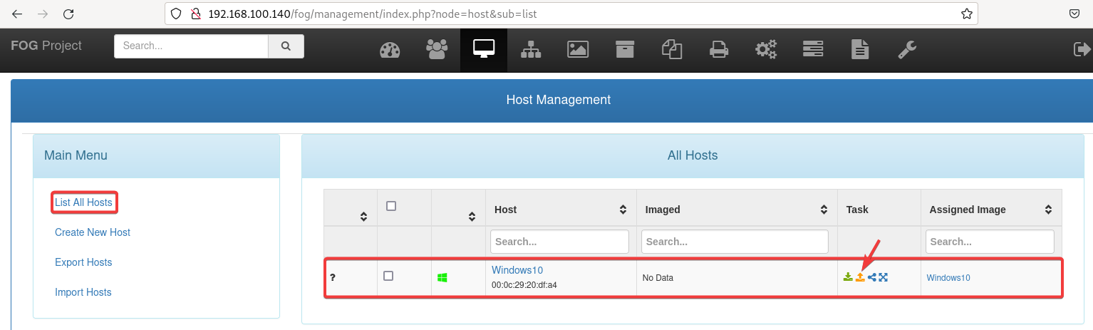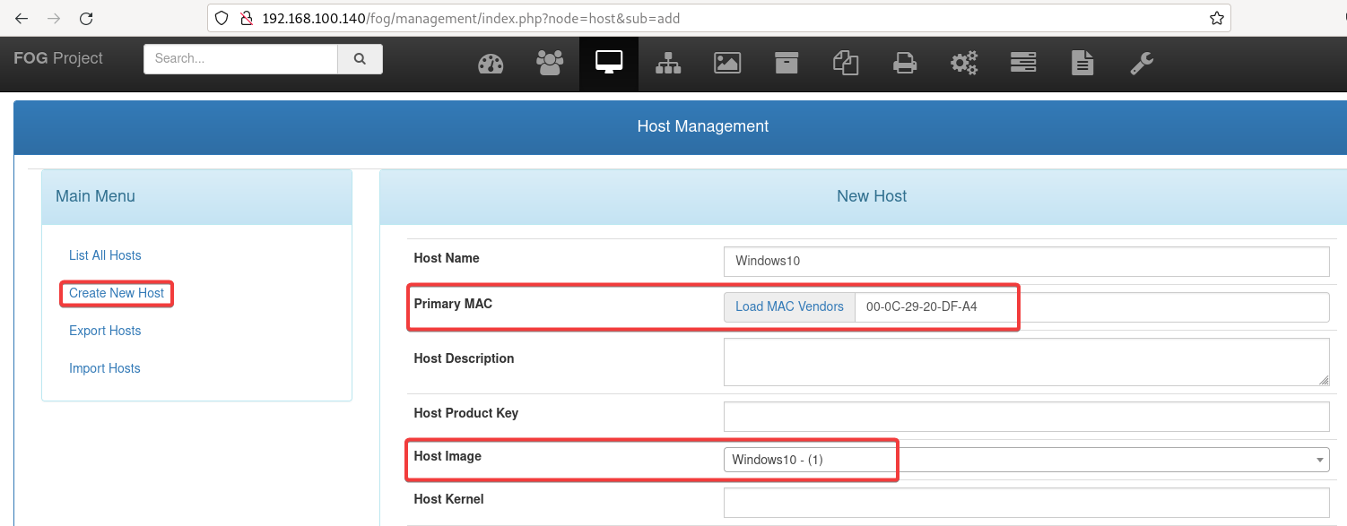 Luego, crearemos un nuevo host, indicando la dirección MAC y la imágen que hemos creado antes.