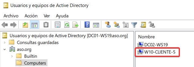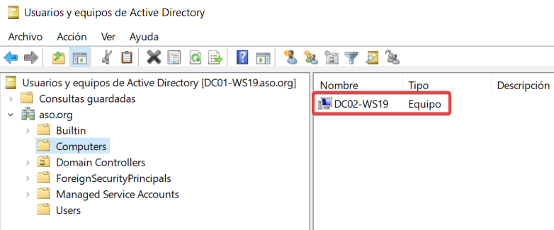 Aquí veremos que el DC02 está añadido al dominio en el contenedor Computers.