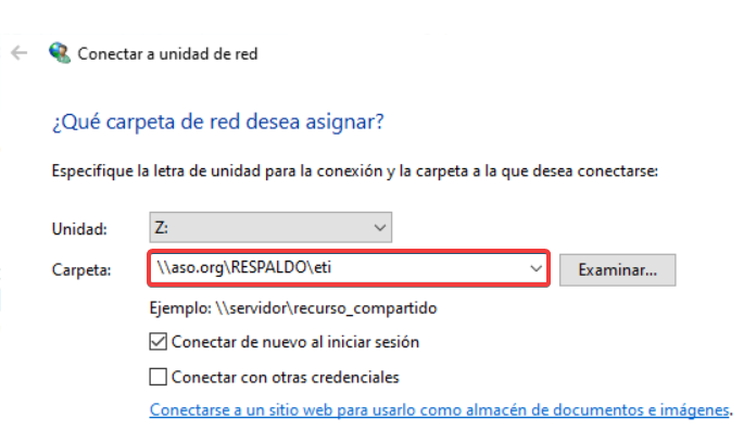 Añadiremos una unidad de red con la ruta de destino que hemos creado.