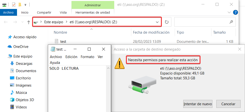 Veremos que se ha añadido, y solo tenemos permisos de lectura. Podemos ver el contenido del archivo de texto pero no podemos crear nada.