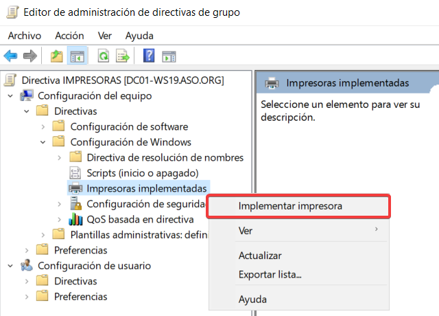 Luego, en el Administrador de impresión, seleccionamos la impresora e implementamos una nueva directiva de grupo.